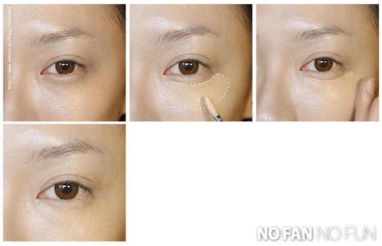 左上: Now Look 中上 : 大面積塗再黑眼圈部分( 避開臥蠶 ) 右上: 用指腹輕壓 左下: Now Look